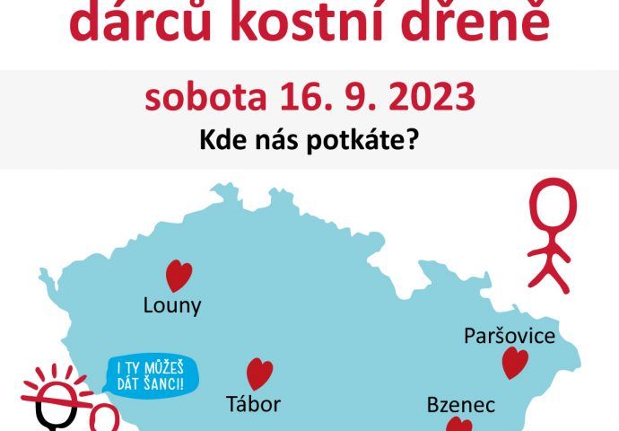 Jako tradičně oslavíme Světový den dárců kostní dřeně sérií náborů po Česku. Kde nás letos v sobotu 16. 9. 2023 potkáte? Připojte se k oslavám. Pokud můžete, zaregistrujte se k nám. Nebo nám pomozte sdílet