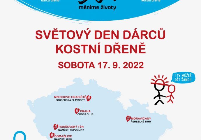 Jako tradičně oslavíme Světový den dárců kostní dřeně (17. 9. 2022) sérií náborů po Česku. Kde nás letos potkáte? Mnichovo Hradiště https://bit.ly/3TQlijT Praha https://bit.ly/3B6r1t0 Horšovský Týn https://bit.ly/3xcdK0W Domažlice https://bit.ly/3L0MWGM Bzenec https://bit.ly/3BC7hPP Moravičany https://bit.ly/3cYmfG6 Těšíme se