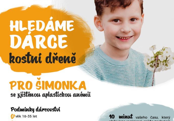 Aktuálně sháníme vhodného dárce kostní dřeně pro malého Šimonka. “Život nám do cesty postavil tvrdou zkoušku. U Šimonka se zjistila aplastická anémie. Hledáme vhodného dárce pro našeho milovaného chlapečka. Pomozte nám ho najít, prosím”, píše