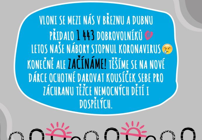 Český národní registr dárců dřeně začíná po koronavirové pauze opět nabírat nové dárce ochotné darovat kousíček sebe pro záchranu těžce nemocných dětí i dospělých. V loňském roce se zapsalo během března a dubna 1 443 dobrovolníků.