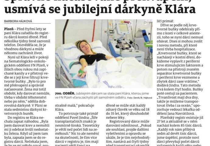 Ve Fakultní nemocnici v Plzni slavíme výjimečný den. Dárkyně Klára je přesně 700. dobrodincem, který svými krvetvornými buňkami pomáhá vážně nemocnému člověku. Klára si nechala odebrat buňky pomocí separátoru, tedy metodou při které není třeba