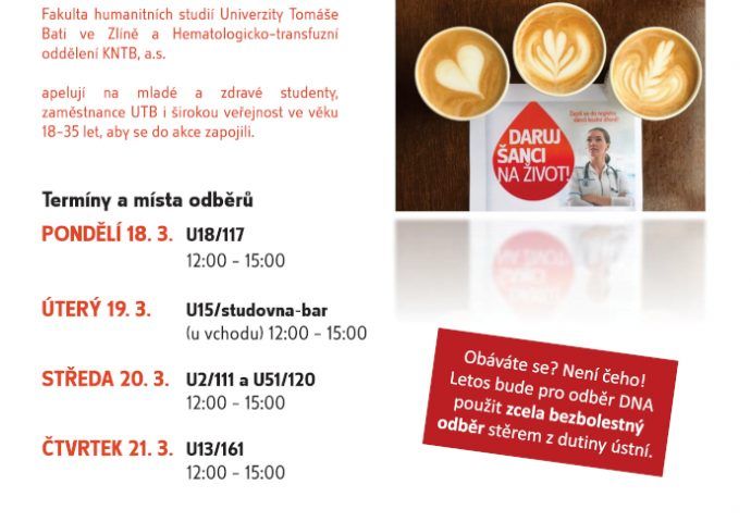 Fakulta humanitních studií Univerzity Tomáše Bati ve Zlíně se v březnu opět zapojí do dobročinné činnosti. Ve spolupráci s Hematologicko-transfuzním oddělením KNTB, a.s. proběhne akce s názvem „Daruj šanci na život! Zapiš se do registru